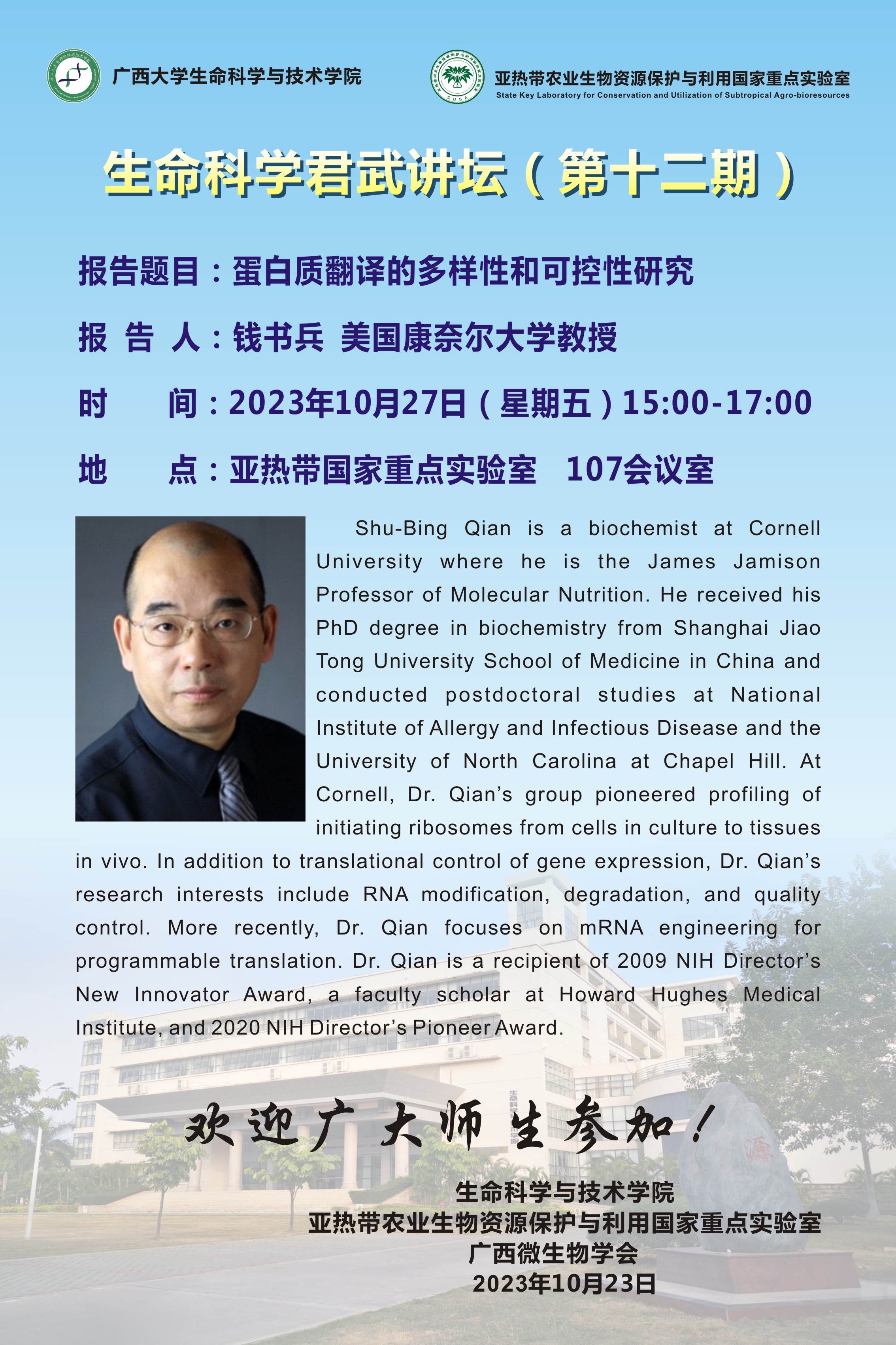 生命科学君武讲坛(第十二期):蛋白质翻译的多样性和可控性研究