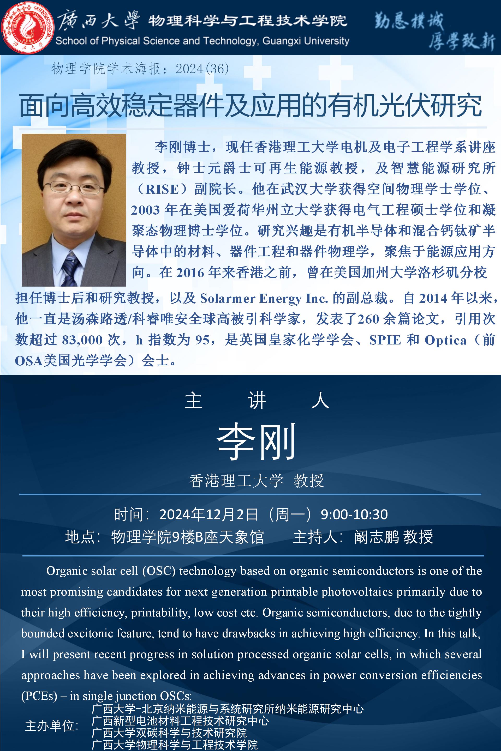 物理学院学术报告:面向高效稳定器件及应用的有机光伏研究