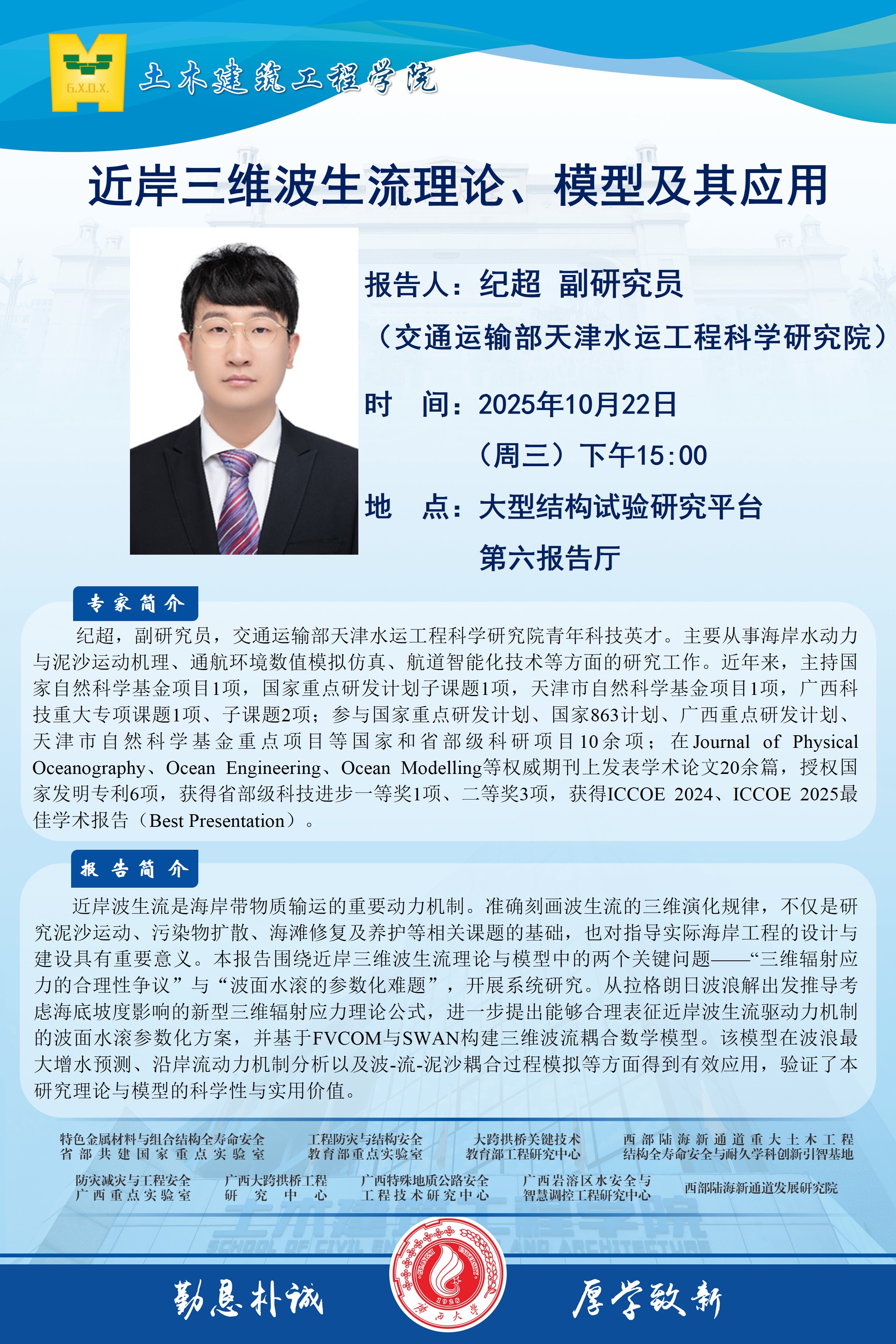 土木建筑工程学院学术报告:近岸三维波生流理论、模型及其应用