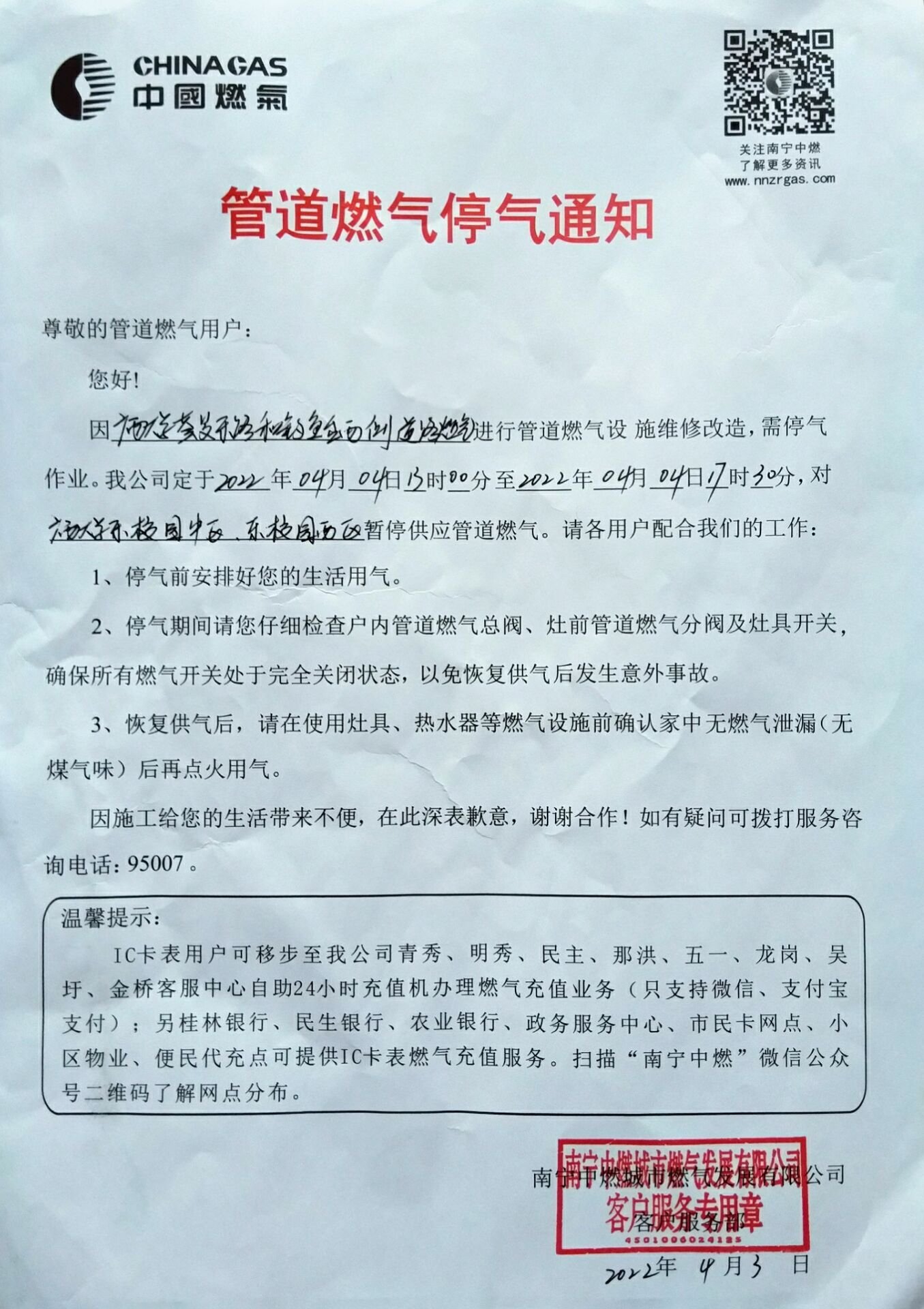 管道燃气停气通知